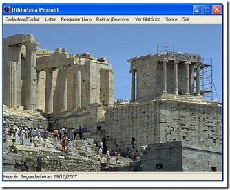 O software Biblioteca Pessoal permite o cadastramento do seu acervo por autor, gênero, editora e livro, possui também os recursos de pesquisa, criação de lista e gerenciamento de retiradas e devoluções, assim você não corre o risco de emprestrar aquele seu livro que você tanto adora para um amigo e nunca mais tê-lo de volta rsrsrsrsrs (eu já perdi alguns).